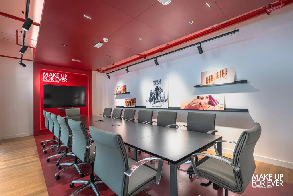 The main boardroom is characterised by a bold theme, with the ceiling and a feature wall, upholstered in red velvet, behind a large flat-screen TV painted in the brand’s signature shade. This vibrant wall also features the Make Up For Ever logo.