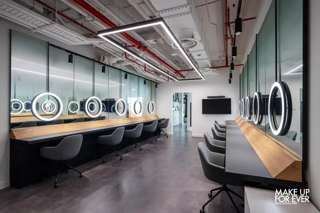 The refurbishment introduces a dedicated make-up training centre, underscoring the brand’s commitment to education in the beauty industry. The room is designed with a modern and professional aesthetic, featuring a long, sleek counter that serves as a workstation for makeup training. Above the counter, a row of large, circular mirrors with built-in ring lights provides ample illumination, essential for detailed makeup application and instruction.