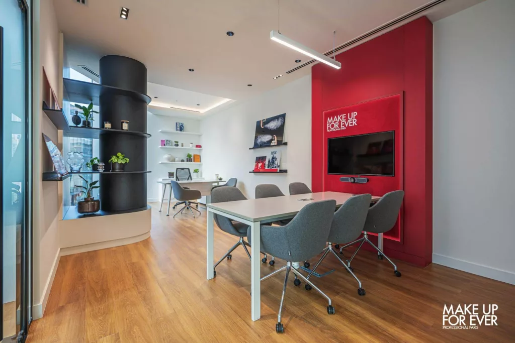The overall design of the office is focused on combining functional workspaces with elements of the Make Up For Ever brand, creating a cohesive and branded environment that encourages creativity and collaboration.